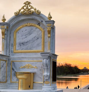 The current “gold toilet” is a direct reference to the much-discussed renovation of the White House interiors that Trump himself has bragged about. The artists use this image as a symbol of excessive luxury and political vanity.