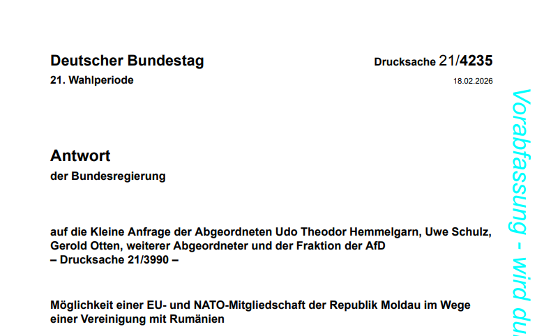 Соответствующий малый запрос был направлен федеральному правительству в начале февраля, по инициативе депутатов «Альтернатива для Германии» (AfD), включая ее лидера др. Алису Вайдель. Авторы ссылались на интервью Майи Санду, в котором она «выступила за объединение своей страны с членом ЕС и НАТО — Румынией».